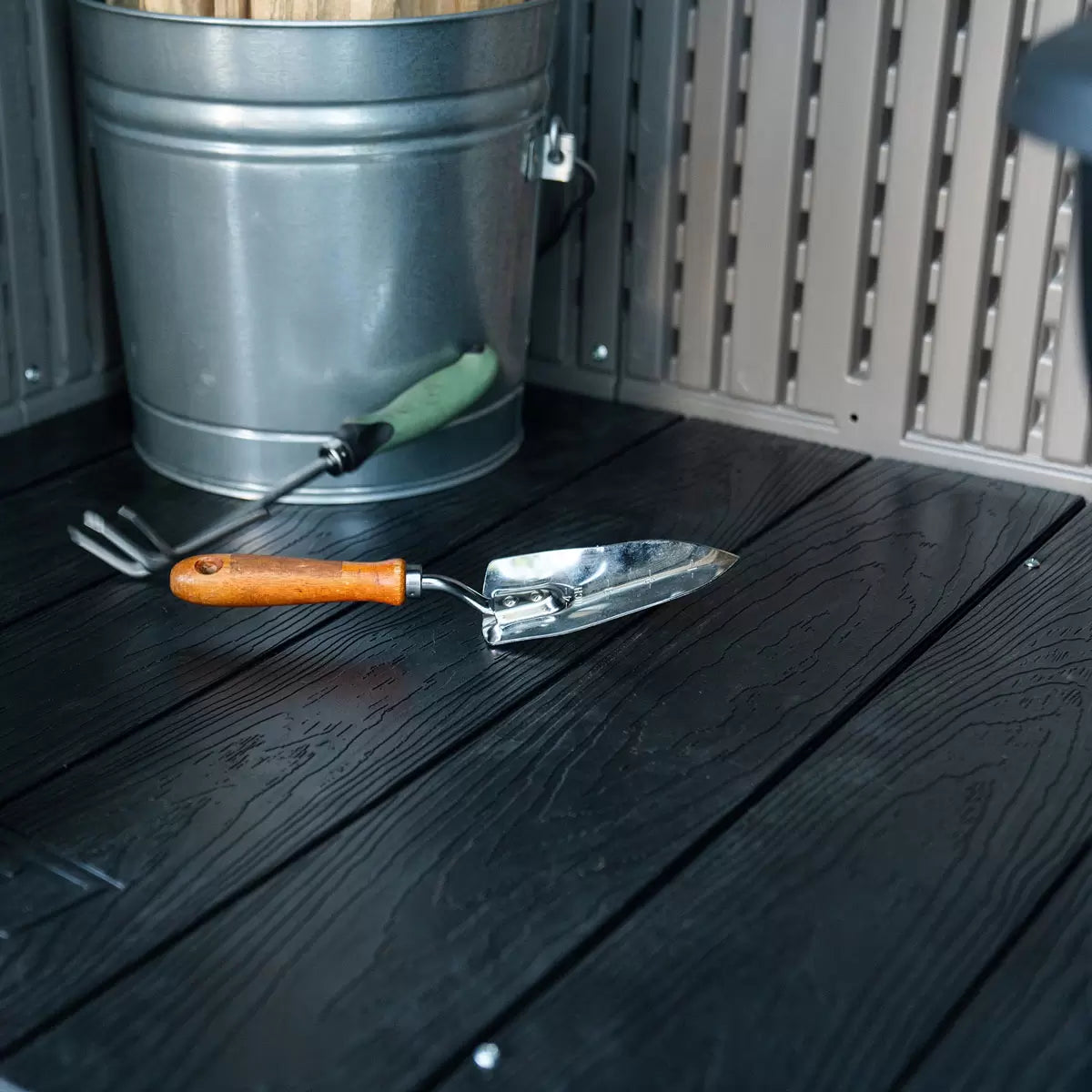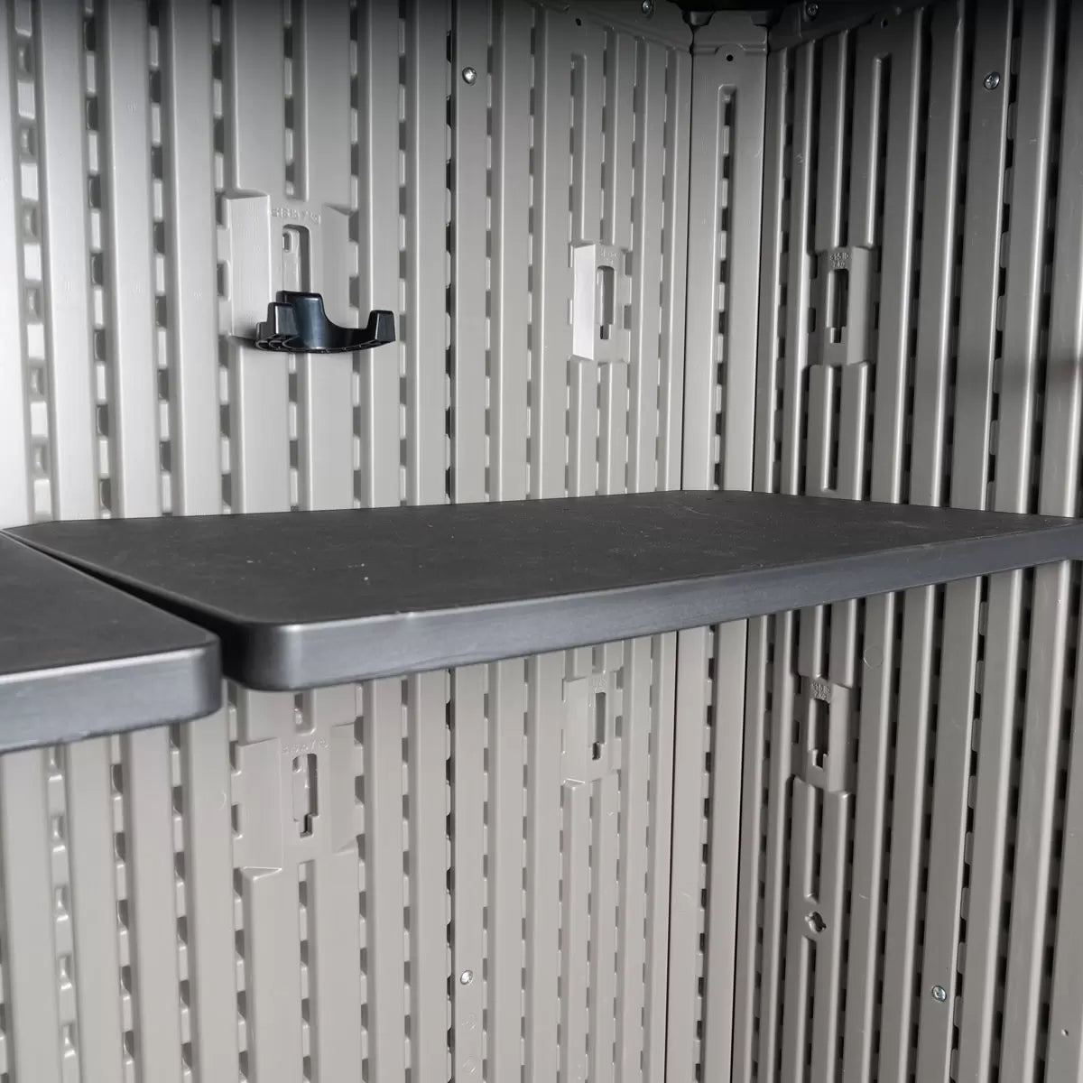 Organise it your way with six included wall hooks and configurable shelves for custom arrangement, and keep your goods secure using two deadbolts and a sliding, lockable bar latch. Your shed will stay sturdy and secure thanks to a steel-reinforced frame and dual-wall HDPE construction. You can enjoy the attractive look that features Rough Cut wood texture door panels and additional wood grain detailing, so not only will you be able to keep your lawn and garden neat and organised, but you’ll be able to do it in style.