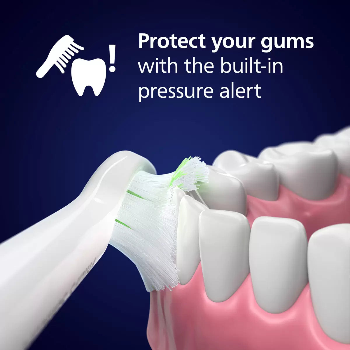 - Built-in pressure sensor protects your teeth and gums by alerting you when you’re brushing too hard