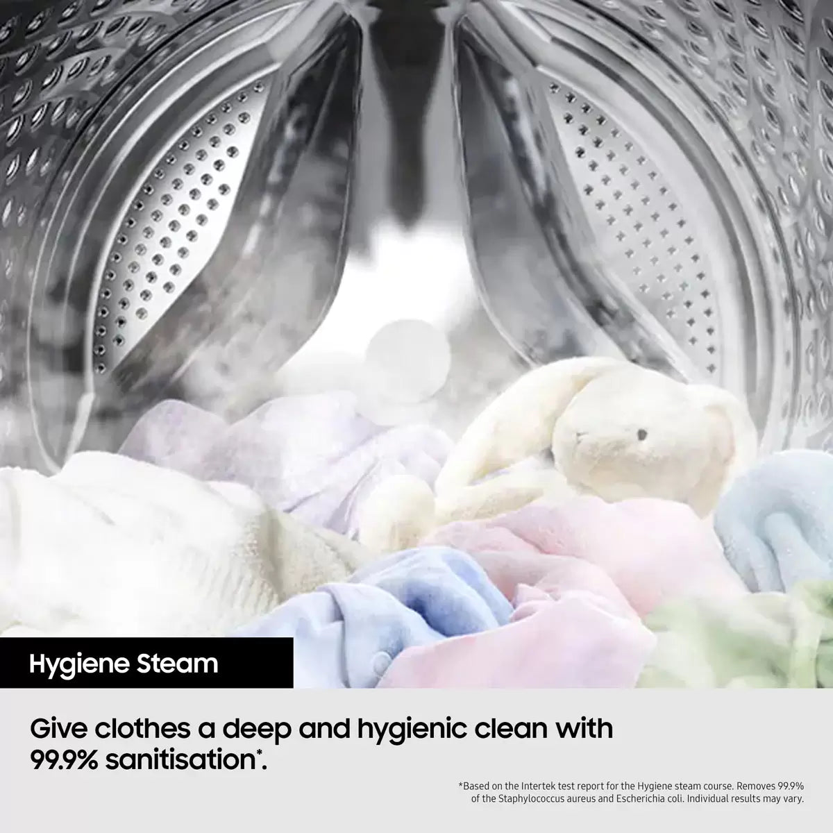 When it comes to deep-down cleaning, not all washing machines are up to the job. So it’s good to know that Hygiene Steam on your Samsung washing machine banishes the things you can see and those you can’t – bacteria, pollen, dust mites and more. The steam is released upwards to make sure every last item gets a deep and even clean. The results? 99.9% of bacteria are obliterated and allergens inactivated. No pre-soaking, no hassle, no worries.