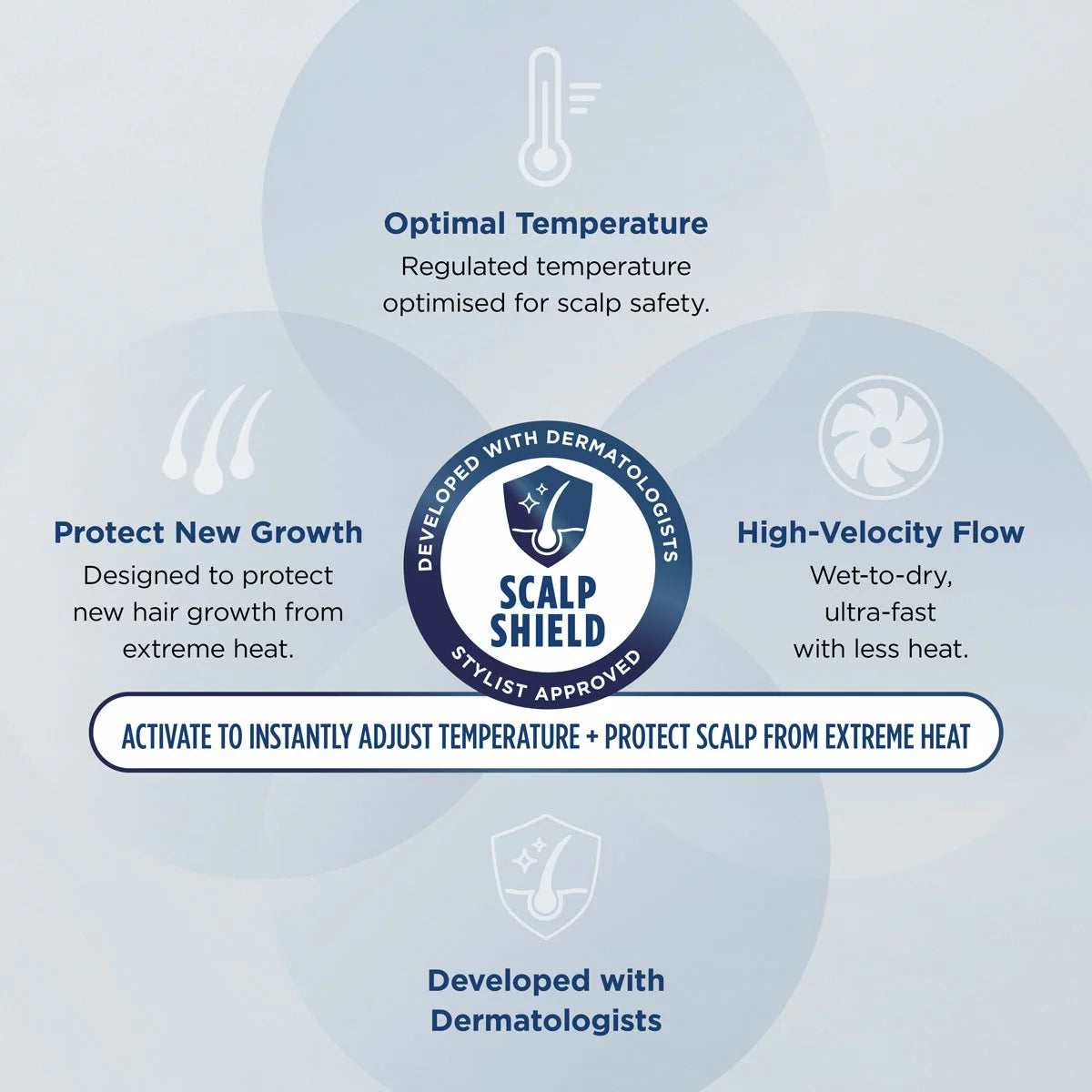 Scalp Shield Mode: Activate to instantly reduce air temperatures to the optimum safe level for scalp comfort and root drying. Designed to protect new hair growth from extreme heat. Developed with dermatologists. Approved by stylists.